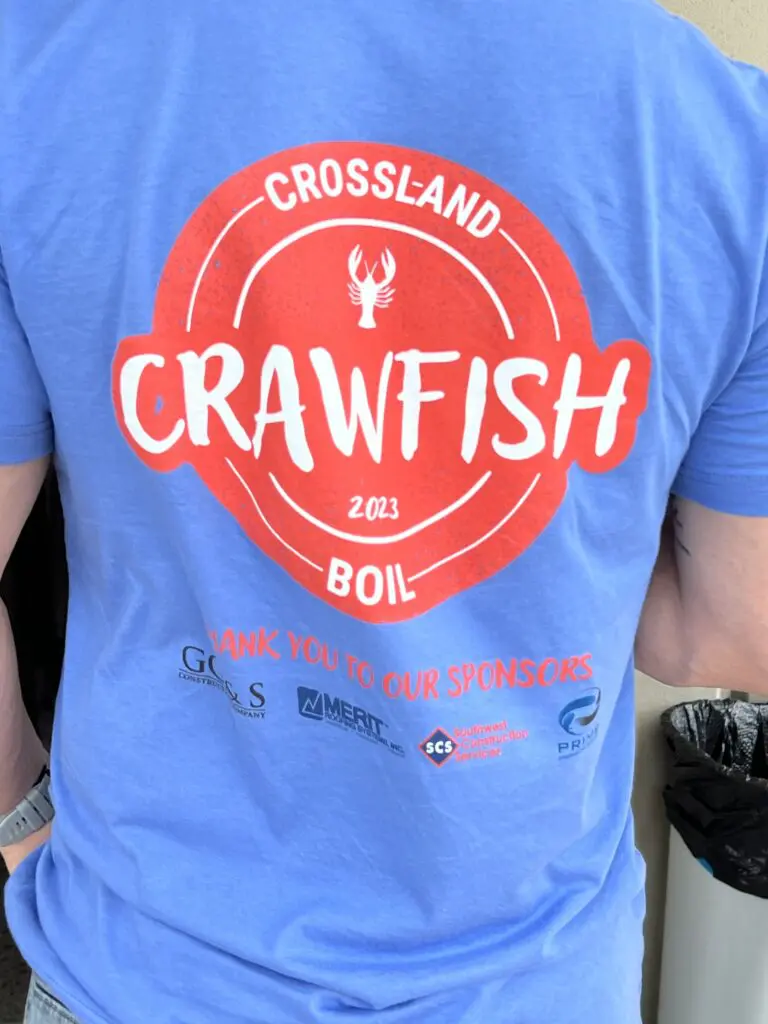 View larger photo. Photo description: A person wearing a blue t-shirt with a large red and white logo on the back that reads "Crossland Crawfish Boil 2023." Sponsor logos are printed below the text.
