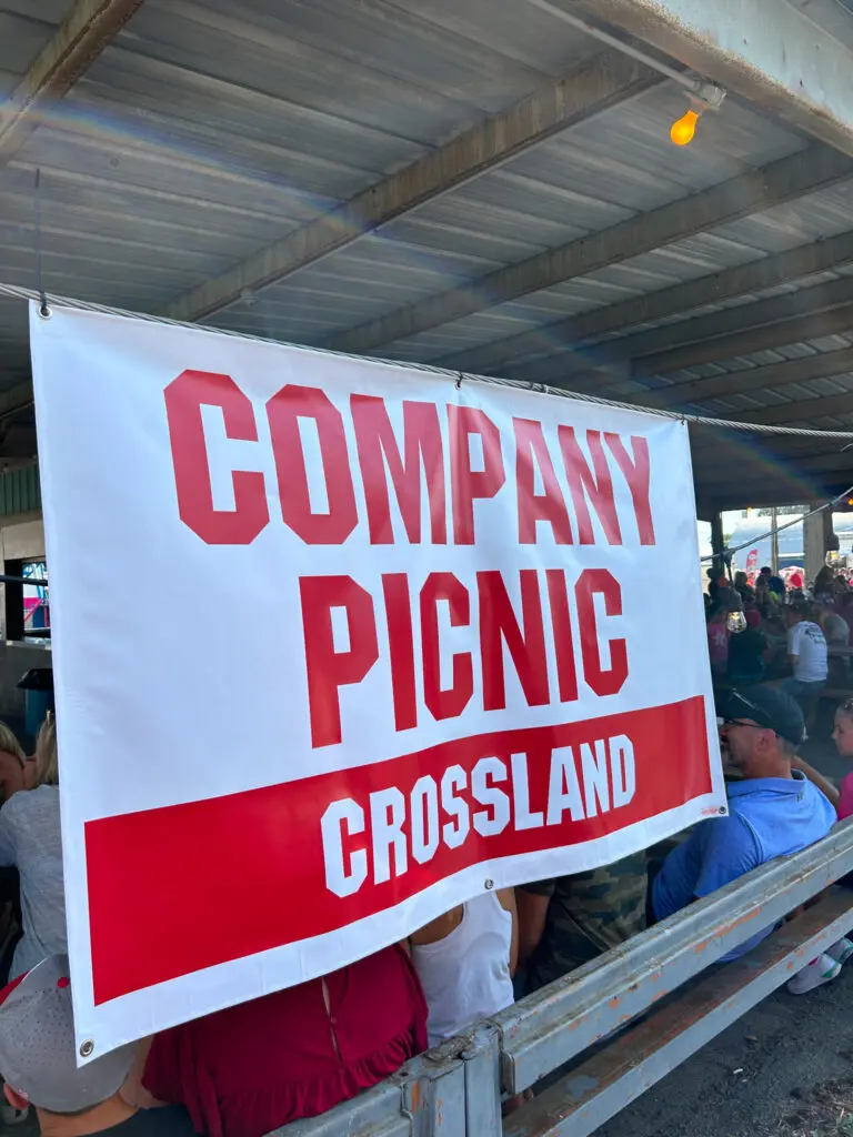View larger photo. Photo description: A large white banner with bold red letters reads “COMPANY PICNIC CROSSLAND.” It hangs on a metal pavilion filled with seated people attending the event. Sunlight streams in from the side.