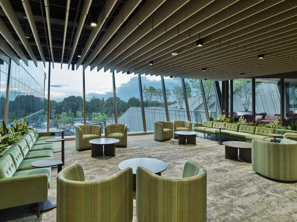 Inside, the 154,000 square-foot facility houses a simulation center, anatomy lab, wellness studio, café, student lounges, and public gallery spaces. Outside, more than 550 trees and 140,000 native plants surround outdoor classrooms, trails, healing gardens, meditation terraces, and a 215-foot water feature.