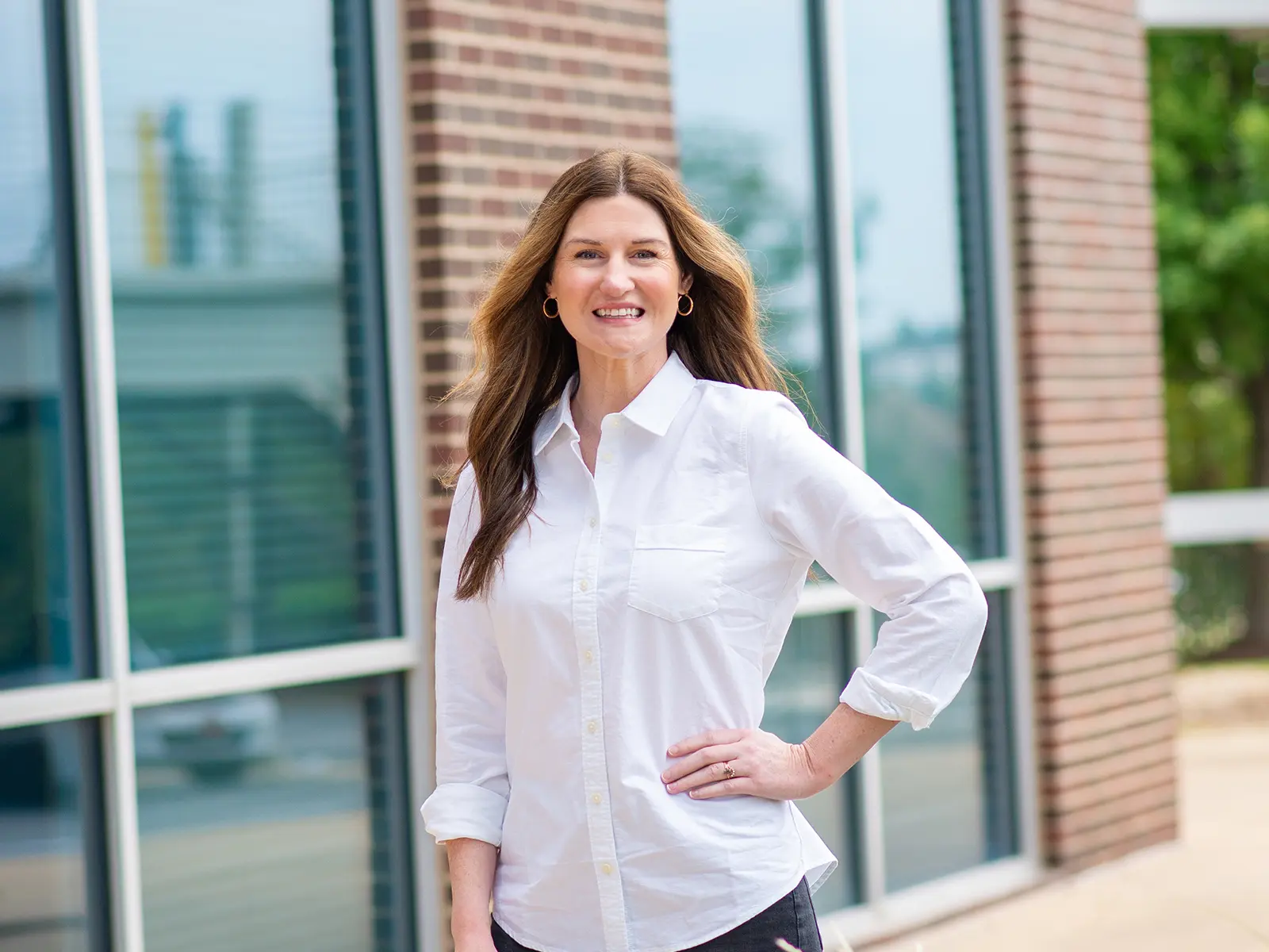 A woman with long brown hair, wearing a white button-up shirt, stands smiling with one hand on her hip in front of a building with large windows and brick walls.