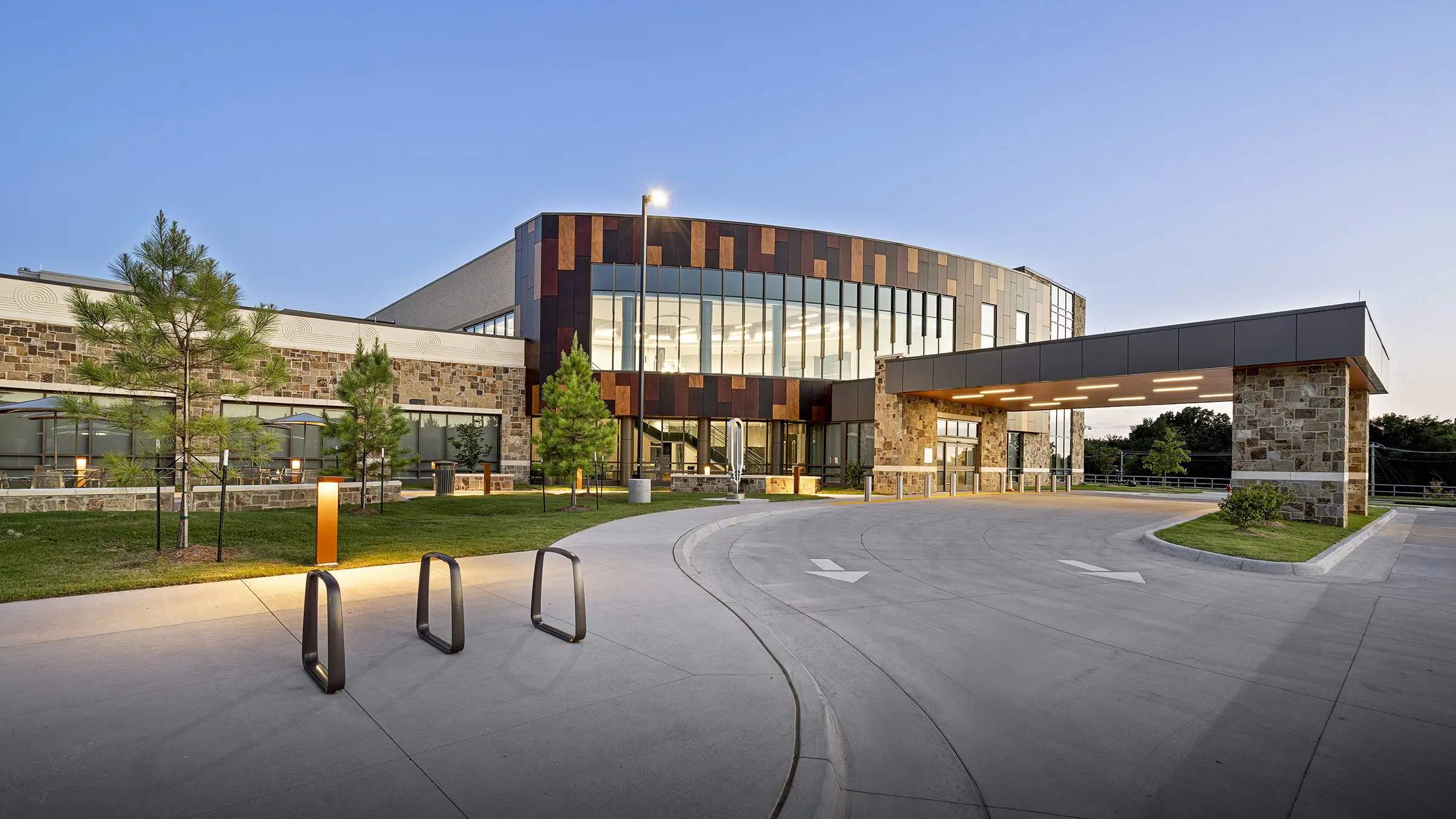 Modern building with large windows and a covered driveway, featuring stone and wood panel exteriors, surrounded by small trees and landscaped grass areas, under a clear blue sky at dusk.