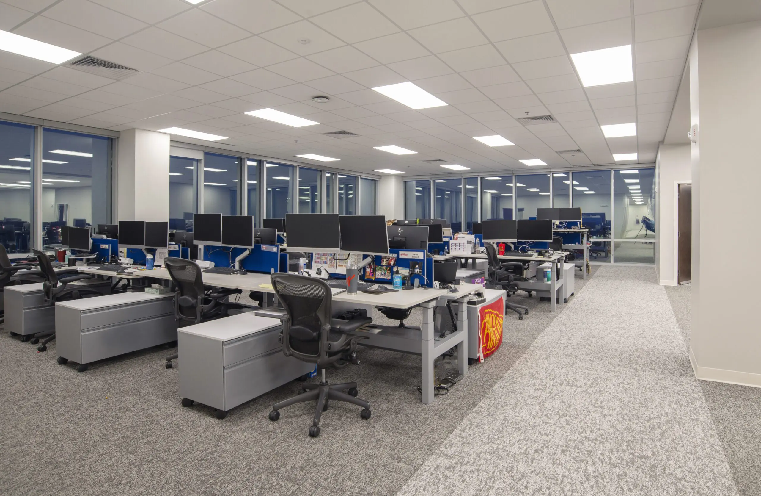 The space provides cubicles, offices, a breakroom, and conference rooms for Kellogg business operations. Standard office finishes were used, including glass storefronts, whiteboard paint, accent walls, and quality millwork. Crossland maintained consistent communication and coordination between the building construction teams and tenant space management to complete the project on time.