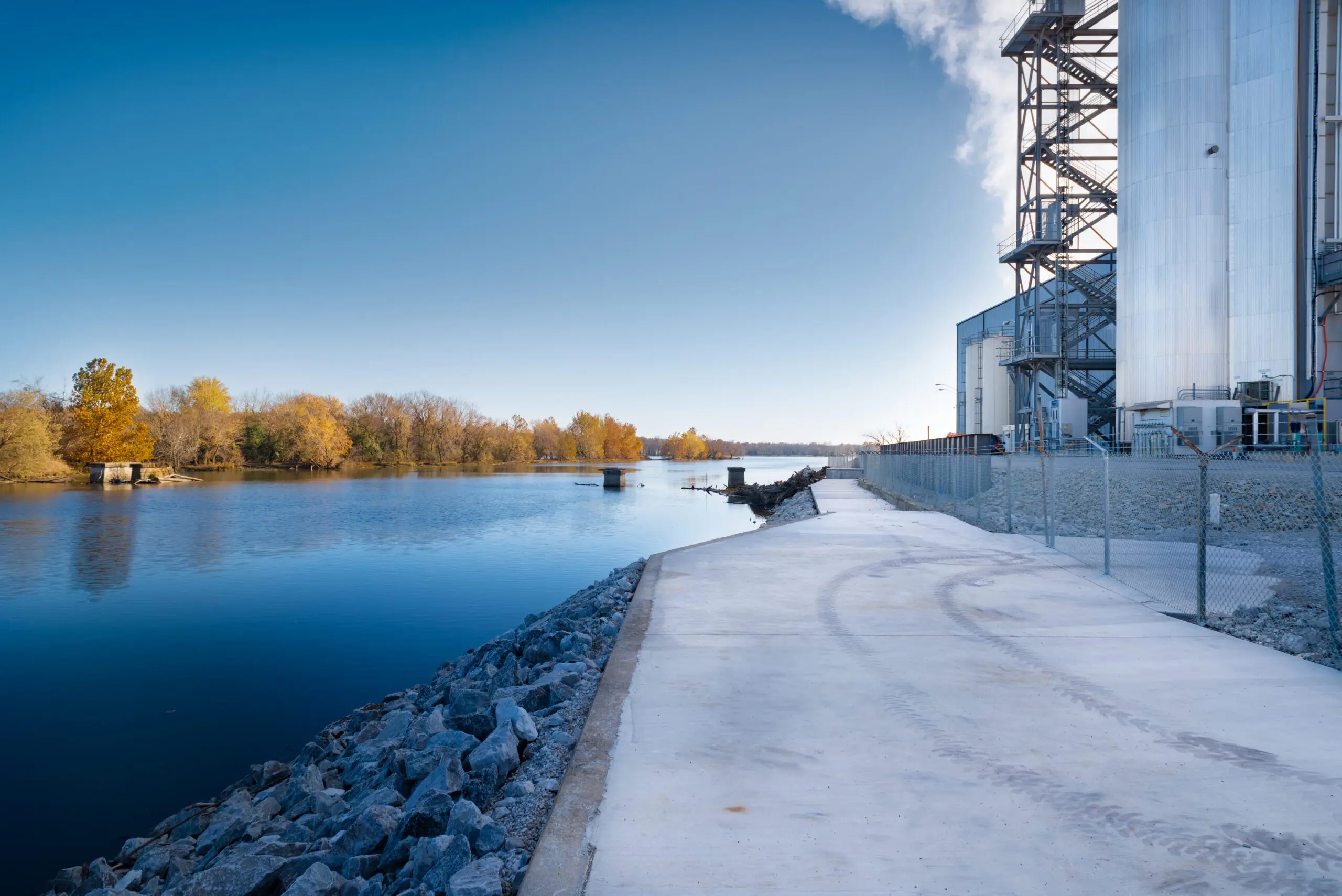 This project was commissioned to modify the existing plant effluent flume in Riverton, Kansas from open-top to contained piping. Crossland Heavy Contractors fusion-welded 550 linear feet of 24” HDPE piping to carry plant stormwater and run-off water down the existing flume bed and out into the detention pond to the South of the property. The flume was then filled with concrete to prevent debris from washing in from the river. In total, this project included 2,250 cubic yards of concrete. A new chain link fence was installed to improve site security along with protective riprap to keep large objects from contacting the flume during high water events.